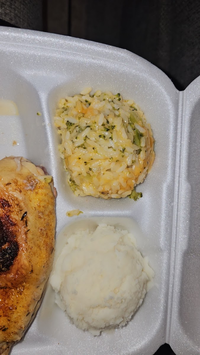 Chopped Steak Mashed Potatoes and Rice with Broccoli